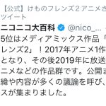 けものフレンズ2公式が『けものフレンズ2』の「ネット流行語100」5位入賞を伝えるニコニコ大百科公式のツイートをリツイート ツイートには「公開までの経緯や内容が多くの議論を呼び」という文言も